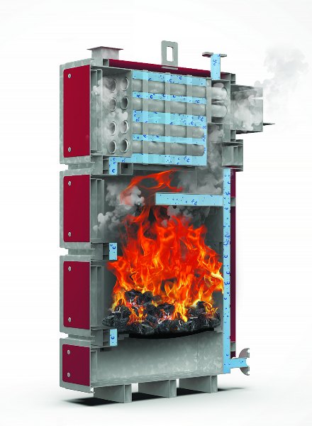 Охлажденные газы выходят из котла через дымоход, соединенный с дымовым патрубком. Расположение дверей теплообменника, засыпной, камеры сгорания и зольника позволяет получить быстрый доступ к топке для очистки и розжига.
